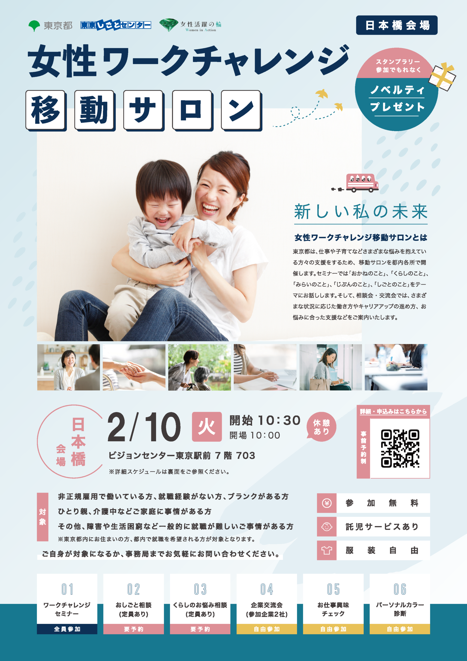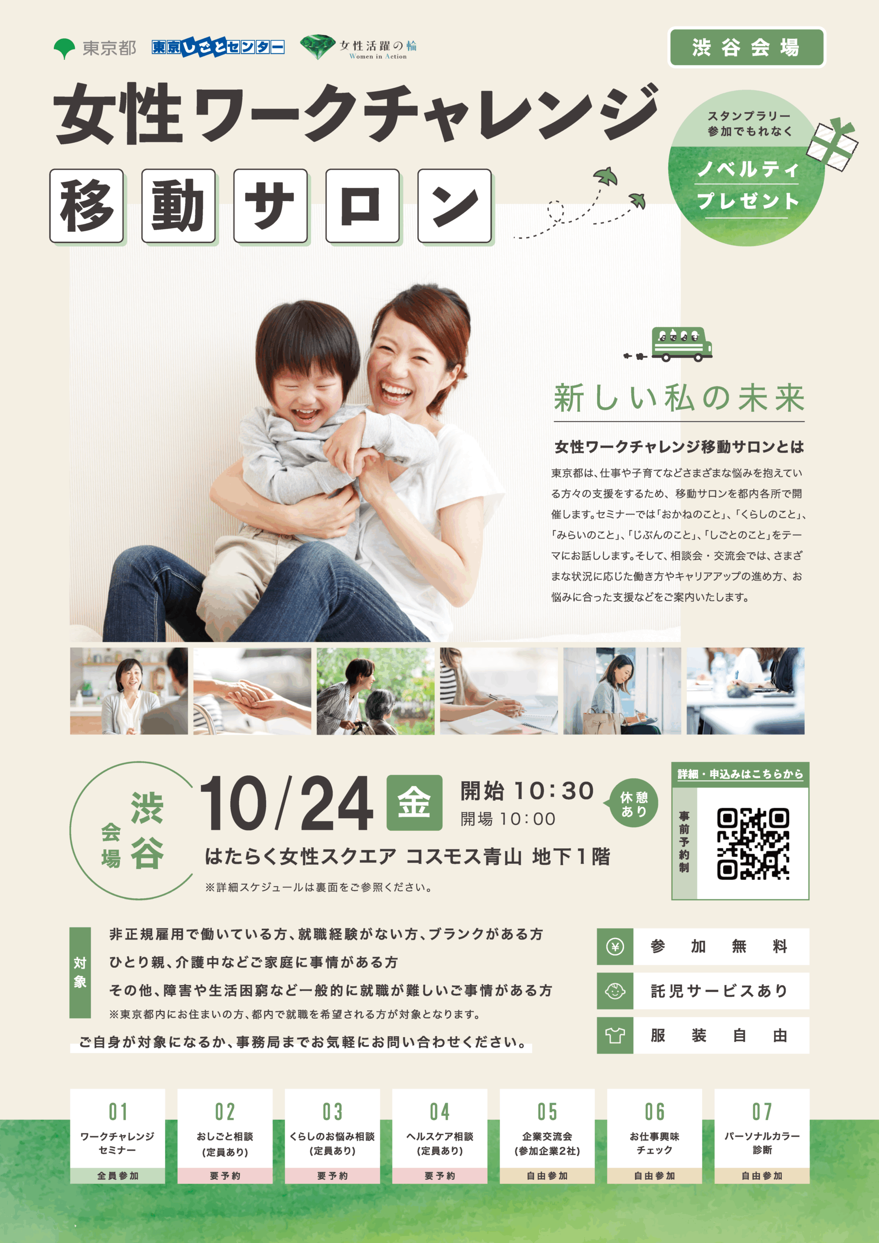 東京都は、就職活動や就職を希望しながらも仕事や子育てなどさまざまな悩みを抱えている方々の支援をするため、移動サロンを都内各所で開催します。セミナーでは「おかねのこと」、「くらしのこと」、「みらいのこと」、「じぶんのこと」、「しごとのこと」をテーマにお話しします。そして、相談会・交流会では、さまざまな状況に応じた働き方やキャリアアップの進め方、お悩みに合った支援などをご案内いたします。